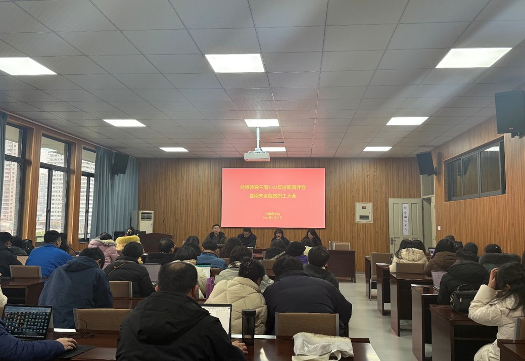 2026-011月23日,学院在厚德楼H512会议室召开处级领导干部2025年述职测评会暨期末全院教职工大会。会议全面总结2025年度工作成效,系统部署期末及假期重点任务,凝聚全院共识推动学院高质量发展。全体教职工参加会议,学校组织部干部科科长王冬冬列席指导,学院党总支书记王润华主持会议。述职测评环节,学院处级领导干部依次进行2025年度工作述职,述职内容紧密围绕德、能、勤、绩、廉五个方面,并结合中心工作与重点任务的落实情况和...