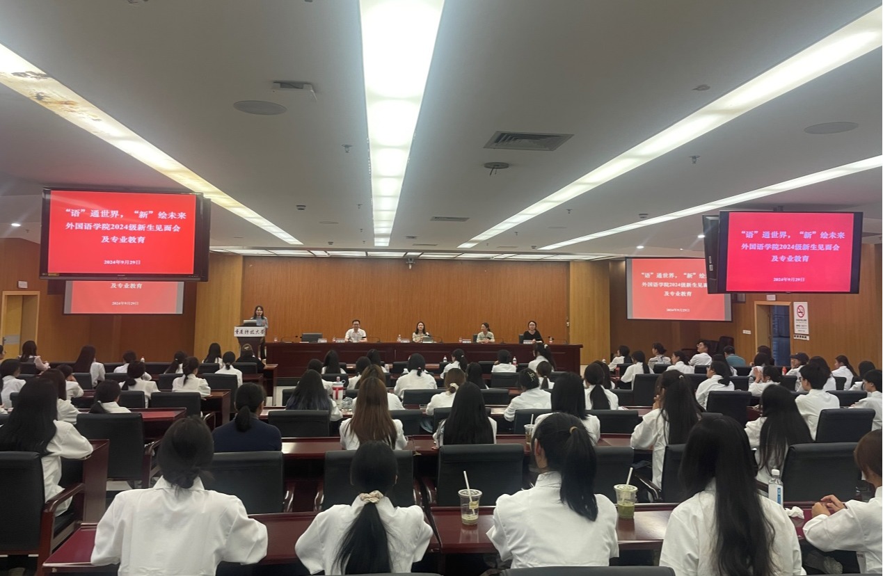 为引导新生尽快完成角色转变,科学规划大学生活,树立正确的世界观、人生观、价值观,努力成长为新时代所需的高素质外语人才,9月29日晚,外国语学院在图书馆906会议室举办了2024级新生见面暨专业教育会,也为“‘语’通世界,‘新’绘未来”外国语学院2024级新生入学教育系列活动拉开帷幕。外国语学院班子成员、各系(办公室)主任、专业导师、辅导员及全体新生参加了本次会议,会议由学院副处级组织员陶兰主持。