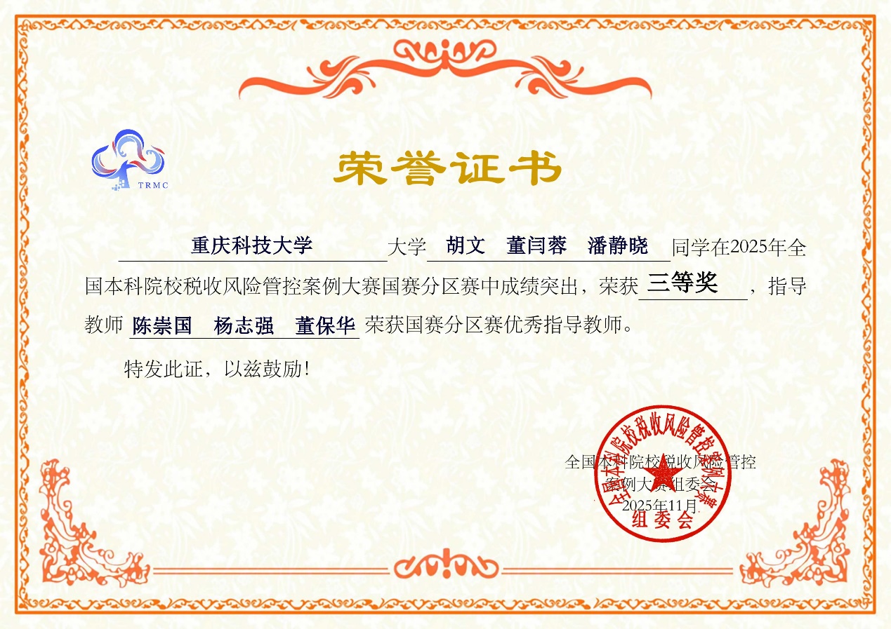 本次大赛聚焦税收风险管控实务,吸引了全国多所院校队伍参与,竞争十分激烈。我院参赛团队在指导教师陈崇国、杨志强、董保华的悉心指导下,围绕赛事主题深入调研、精准分析,从案例梳理到方案设计均展现了较强的实践应用能力,最终在众多参赛作品中脱颖而出。同时,三位指导教师也凭借专业的指导水平,获评“国赛分区赛优秀指导教师”。
