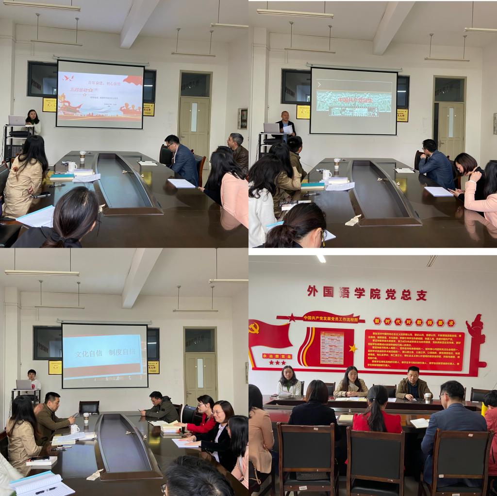 为深入学习贯彻习近平新时代中国特色社会主义思想,巩固拓展“不忘初心、牢记使命”主题教育成果,4月14日下午,外国语学院党总支在厚德楼H206党员活动室开展了“百年奋进,初心弥坚”主题党课比赛初赛。学院班子成员、总支委员、支部书记、支委、各系(中心、教研室、办公室)主任以及学生代表参加了此次活动。